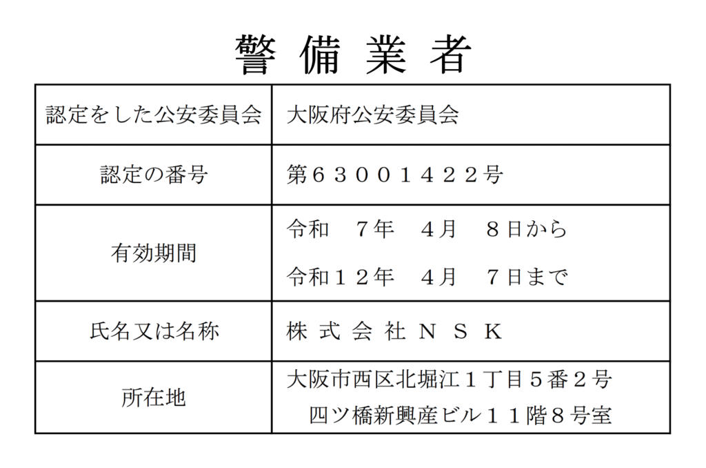 | 加盟団体 | 一般社団法人・大阪府警備業協会 |